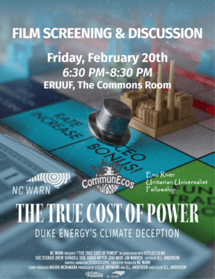 Join NC WARN, CommunEcos and Eno River Unitarian Universalist Fellowship on Friday, February 20 from 6:30-8:30pm at the Commons Room at ERUUF for a short documentary screening and discussion. This is a plant-based potluck — bring a dish if you’re able!